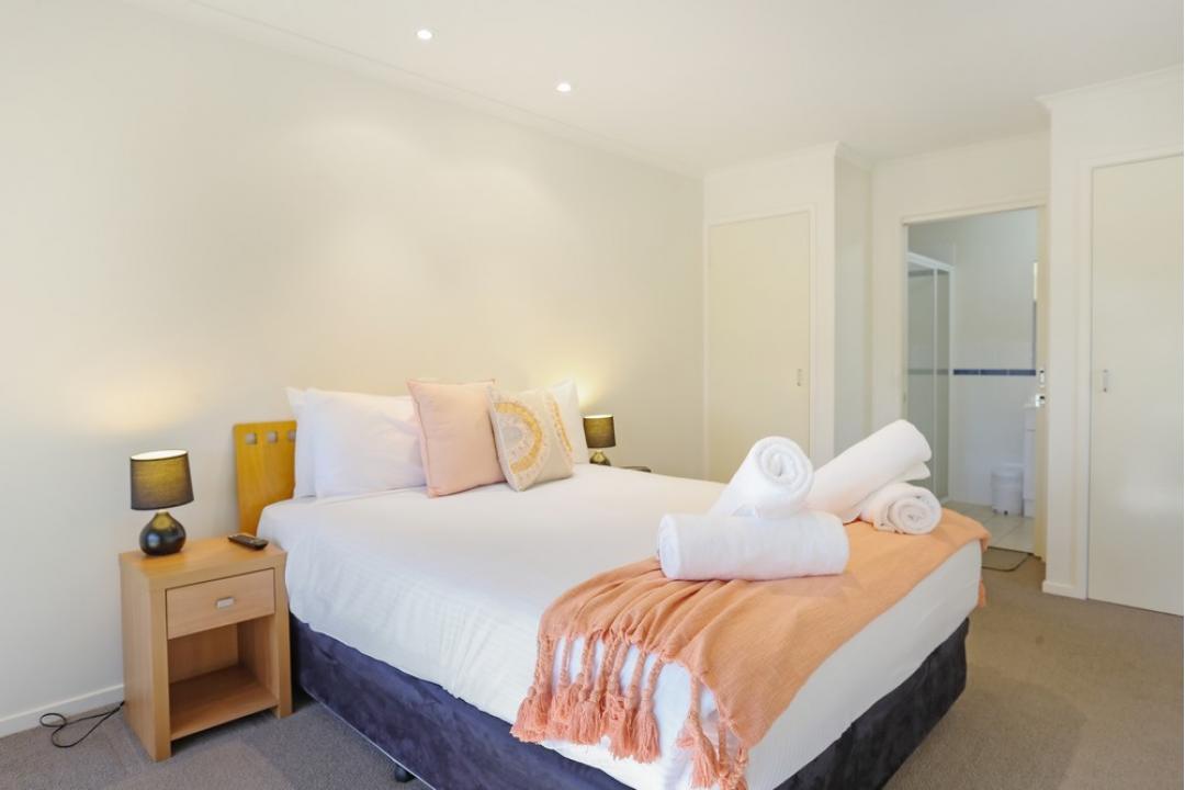 Each apartment features a queen-sized bed, an ensuite bathroom with a spa bath, a spacious lounge, a private balcony, and a fully equipped kitchen.